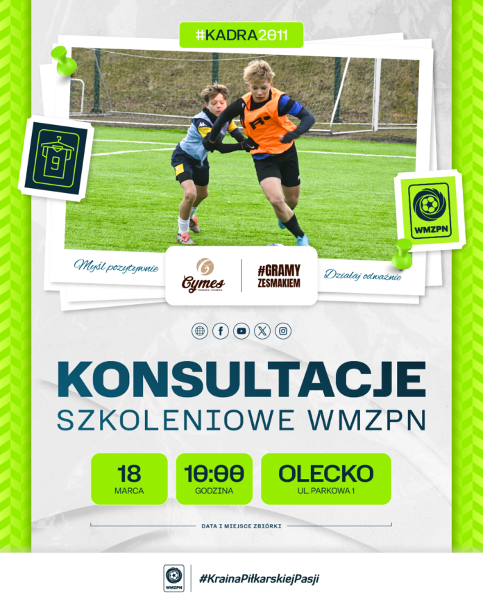 W dniach 18-19 marca w Olecku odbędzie się konsultacja szkoleniowa Kadry WMZPN rocznika 2011. Podczas zgrupowania kadra rozegra dwa mecze kontrolne z Podlaskim ZPN (17.03 o godz. 17:30 i 18.03 o godz. 10:00)