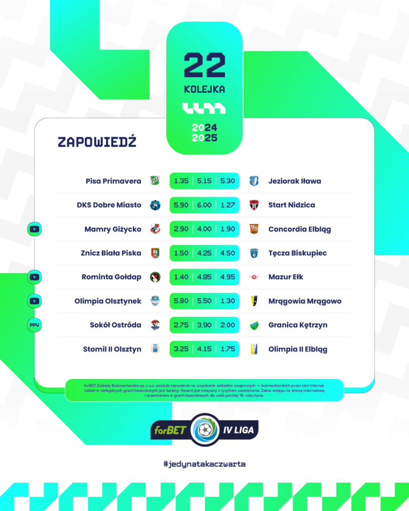 W najbliższy weekend kibice forBET IV ligi znów będą mieli okazję emocjonować się ośmioma spotkaniami, które mogą sporo namieszać w tabeli. Na szczycie trwa bezpośrednia walka o awans pomiędzy Startem Nidzica a Zniczem Biała Piska, ale także w środku i na dole tabeli czekają nas ważne rozstrzygnięcia. Oto szczegółowa zapowiedź 22. kolejki.
