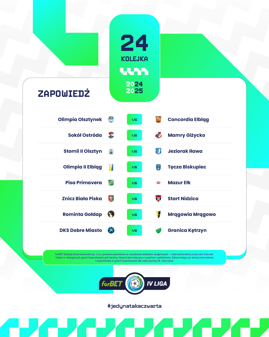 Czas na 24. kolejkę forBET IV Ligi! Przed nami seria spotkań, która może znacząco wpłynąć na układ tabeli – zarówno w walce o awans, jak i o utrzymanie.
