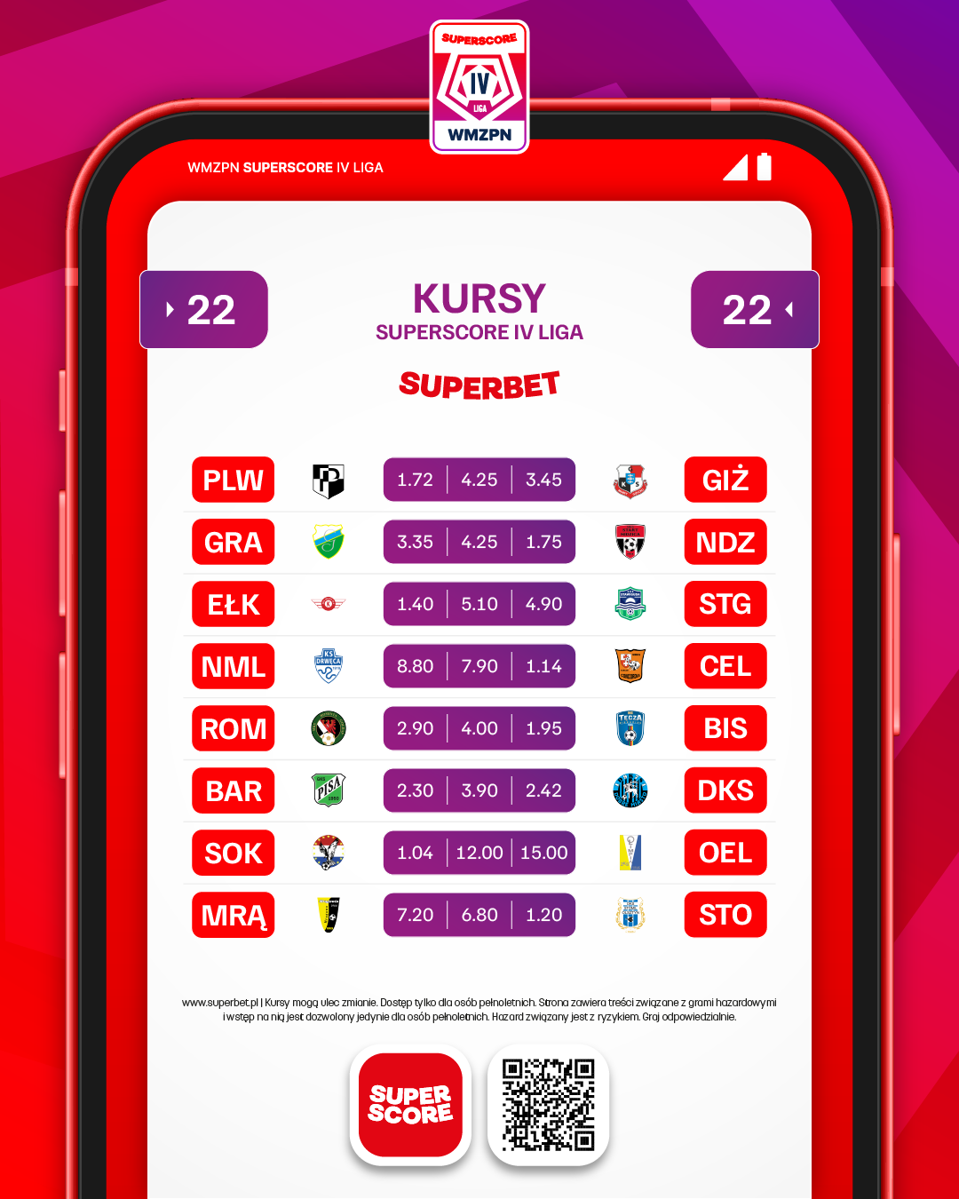 Przed nami 22. seria spotkań Superscore IV Ligi, która zapowiada się niezwykle ciekawie zarówno w kontekście walki o awans, jak i utrzymanie. W czołówce ścisk – liderujący Stomil ma tylko kilka punktów przewagi nad grupą pościgową, a za jego plecami czai się m.in. Concordia, Polonia i rozpędzony Sokół. Na dole tabeli każdy punkt jest na wagę złota, więc emocji na pewno nie zabraknie.