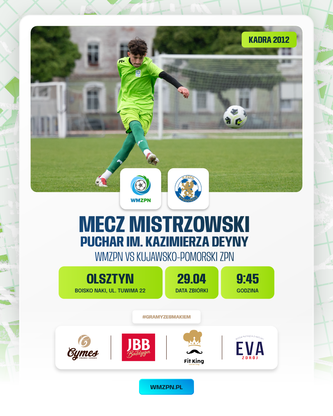 29 kwietnia w Olsztynie Kadra WMZPN rocznika 2012 rozegra mecz mistrzowski z Kujawsko-Pomorskim ZPN.